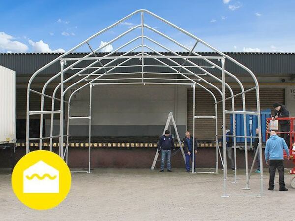 Skladanie stanovej haly zaberie len niekoľko hodín a uľahčí ju vysokozdvižný vozík alebo zdvíhacia plošina, ale inštaláciu zvládnete aj bez nich. Samotná montáž je intuitívna a dá podľa návodu ľahko zvládnuť, všetky spoje sú skrutkové, takže nepotrebujete žiadne špeciálne náradie.